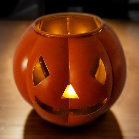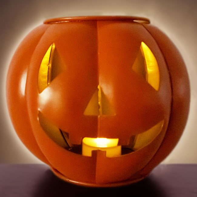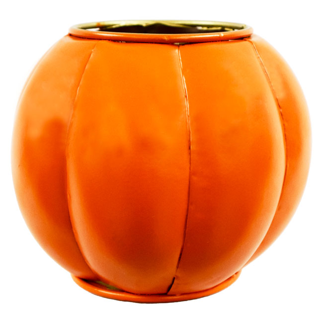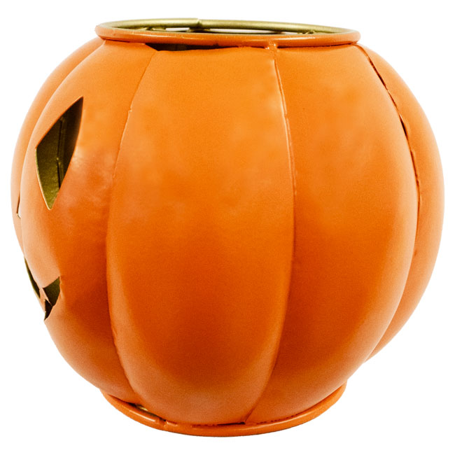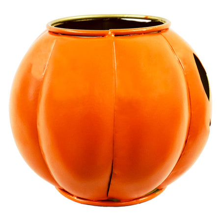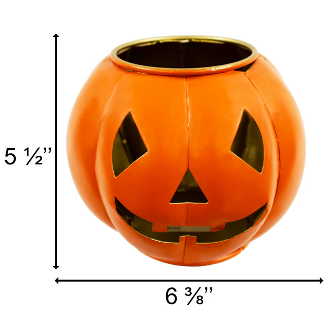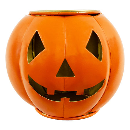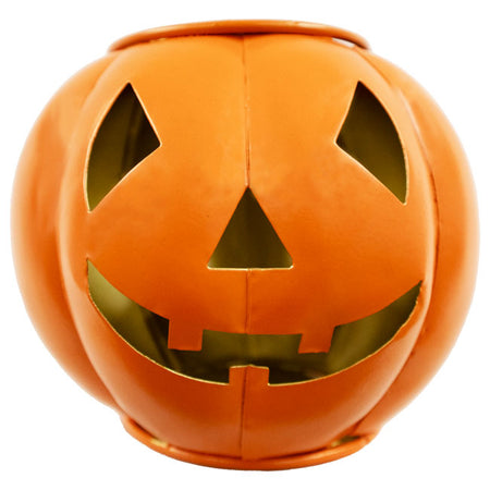 - Compact, metal sphere with shaped cut outs creating a familiar Jack-o-Lantern face