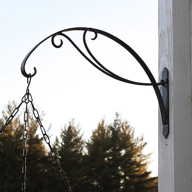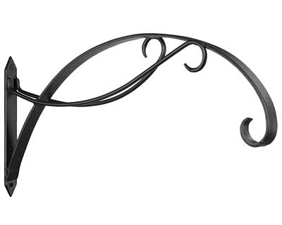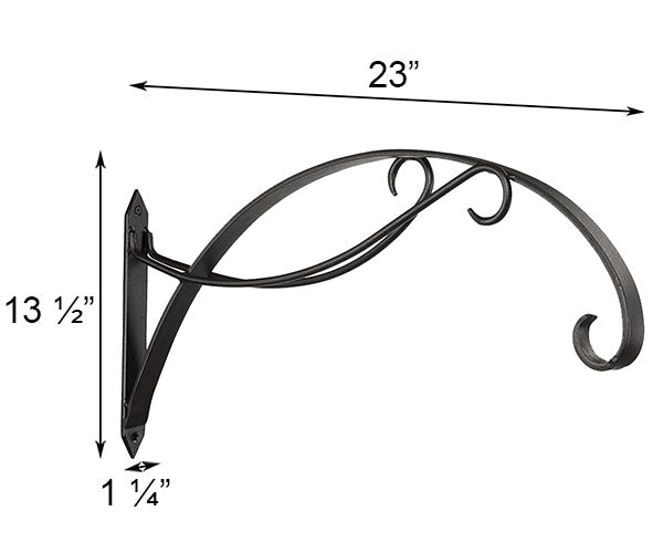 Add a timeless, classic display to your favorite hanging item using this Achla Designs Black Wrought Iron Scroll Bracket. An arched arm on this hardy, wrought iron piece forms the familiar, bracket shape, while two scrolls with an alternating arch flank it. The flat shape of the arm contrasts the rounded, side accents, and culminates in an inward curl. This allows you to showcase items up to 41" in diameter, while the black, powder coated finish lends an elegant hint to your setting. Two predrilled holes on the back plate enable you to place the bracket against a wall or post, and included hardware aid in installation. Place your large hanging item at a wonderful display spot using this Black Wrought Iron Scroll Bracket.