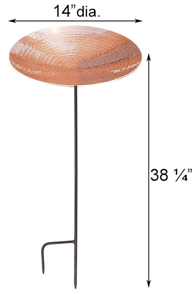 Add an elegant bird haven to a corner of your landscaping with this Achla Polished Copper Metal Bird Bath and Stake. Adding a standing bath to your yard invites birds to frequent the area, and ensures they remain hydrated and healthy. The hammered, textured body, bright copper color, and gentle slope of this bath add wonderful style to your backyard, while the included stake keeps it at a fantastic height for birds. The 14" diameter, stainless steel bowl offers plenty of bathing spots, and its rolled rim provides perching area. This bowl slopes gently downward to a 2" depth, keeping it friendly for small birds, and hammered divots in concentric rings ensure birds can grip the base. The shining, copper plating captures attention easily, while the included stand makes a straightforward display. A threaded port at the base of the bath attaches to this 35.25" tall, wrought iron stake, and its dark bronze color blends with landscaping easily. A 5" long, step-in base helps the stake remain stable in your garden, and the basin removes from this stand for cleaning. The steel and wrought iron construction of this package forms a hardy birding spot, certain to withstand use for many seasons, while the copper plating adds a classic hint. Invite birds to visit your garden by adding this Polished Copper Metal Bird Bath and Stake to it. Some assembly required.