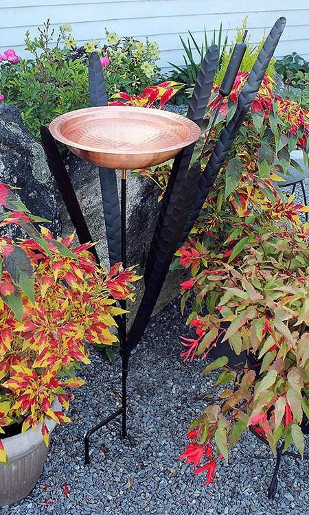 Turn your landscaping into a faux wetland by placing this Achla Copper Single Cattail Bird Bath within your flowers. The lasting, metal body, bold color scheme, and familiar shape of this item add a dynamic look to your garden, and showcase your love of wetlands and the natural world. Wrought iron rods create the leaf and cattail shapes, perfectly surrounding the included, 12.5" diameter, polished copper bath. This basin affixes to one of the stalks on the stand in moments, and its fantastic rim provides perching and preening spots for your feathered friends. A hammered finish throughout the bowl creates a textured base, keeping it safe for birds, and the 2.25" depth allows small and large birds to use it easily. The intricate stand not only frames the basin perfectly; its stalks are adjustable for a truly versatile and custom display. Keep them grouped together for a narrow presentation near the bath, or spread them outward for a more dramatic look. Detailing on this iron stand furthers the exciting realism on the item, and the black, powder coated finish protects it from the elements. Insert the 5.75" long, step-in base into your soil for a stable accent. Bring your love of wetlands to your bird garden with this Copper Single Cattail Bird Bath. Assembly required.