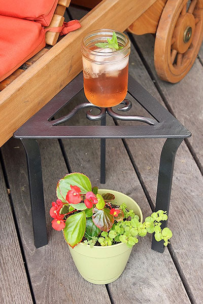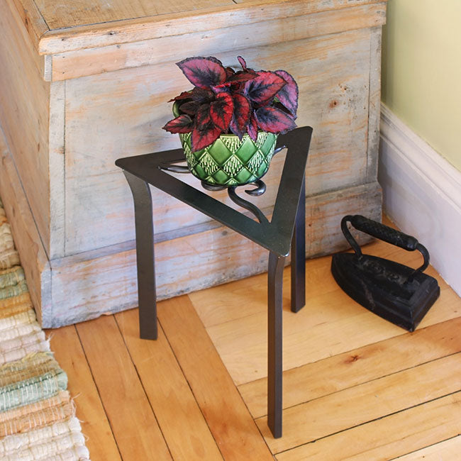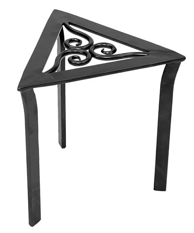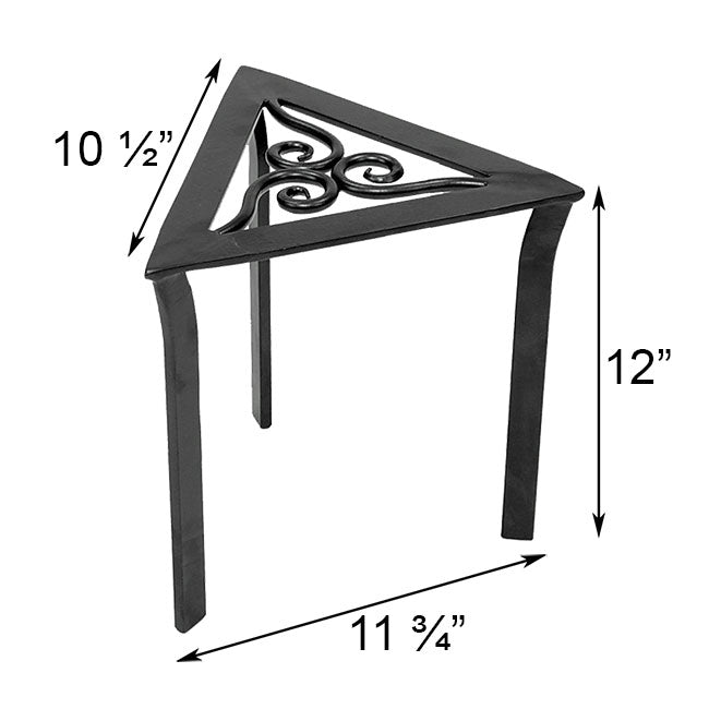 Add fantastic angles and a wonderful support to a potted plant using this Achla Gray Triangular Plant Stand. This striking piece seamlessly blends modern shape with classic style, turning your patio or sunroom into a fashionable retreat. Three legs elevate this unit 12" off of the ground, while supporting the equilateral, triangular top. Three scrolls inside this open shape hold pots with an 8" diameter or smaller base. Its durable, wrought iron construction creates a strong item, and the unique shape allows you to place one side of the stand flush against a wall, or nestle it in a corner of your sunroom for a different look. The deep gray, powder coated finish looks lovely for many seasons, and allows you to situate this item in your landscaping or garden for versatility. Showcase striking angles and a favorite potted plant with this Gray Triangular Plant Stand.