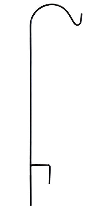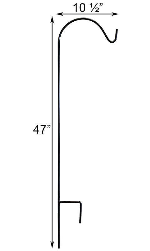 Create a classic display for your favorite hanging adornment using this American GardenWorks Black Floral Basket Hanger. The traditional shape and timeless black color of this sturdy hook enhance a variety of settings, while handily providing a showcase for a bird feeder or flower basket. The gentle, upward arc on this solid, steel shaft brings familiar shape to your yard, and this arm accommodates items up to 21" in diameter for fantastic function. A 4.25" long, step-in base provides stability when inserted in your garden soil, and the powder coated finish protects the durable steel body from elemental wear. The substantial hanger can also be installed in a large pot for hanging items indoors or on your patio, and the compact design is wonderfully suited for hummingbird feeders or decorative lanterns. Turn one section of your landscaping into a display for a hanging item with this Black Floral Basket Hanger. Made in the USA.