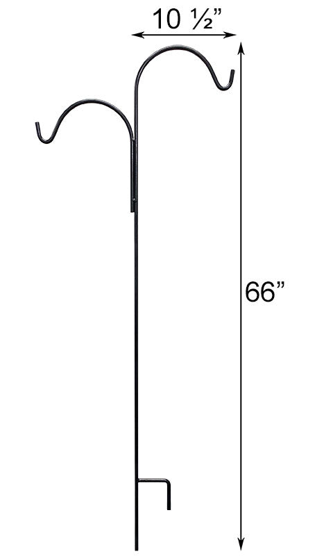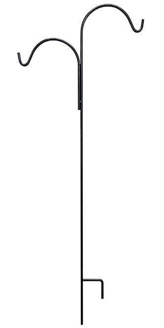 Double the display area in your lawn by installing this American GardenWorks Black Offset Double Shepherd Hook in it. Placing a stand alone hanger in your grass allows you to showcase your favorite bird feeder or outdoor accent at the perfect viewing location, and the sturdy, dual hooks on this unit provide versatility. One hook resting slightly below the other lends visual interest to this item, while the straight, solid steel shaft adds height and support. An upward curl completes each arm, enabling them to hold adornments up to 21" in diameter, and the black, powder coated finish lends elegance and durability. Sink the robust 10" long, step-in base into your garden soil for a secure installation, or use this item inside a large pot for a different and more versatile effect. The steel unit and black body remain durable and classic, and the offset design makes it simple to display a feeder and bird house simultaneously. Add hanging spots to your garden easily with this Black Offset Double Shepherd Hook. Made in the USA.