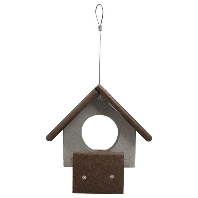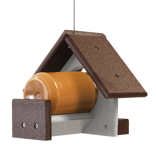 Note: This description refers only to the Amish Made Recycled Plastic Peanut Butter Jar Feeder, Brown and Gray, by Prime Retreat. The jar of peanut butter shown is not included.
