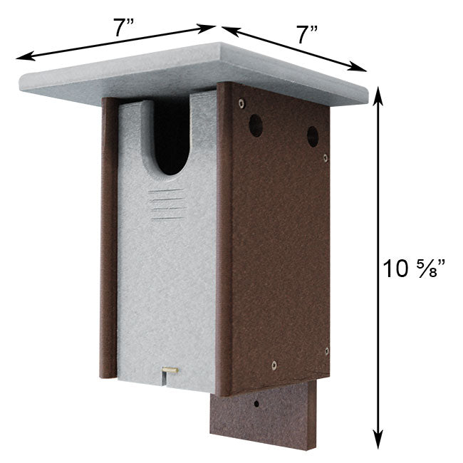 Add a unique bluebird nesting box to your yard with this Gray and Brown Amish Made Recycled Plastic Sparrow Resistant Bluebird House. Providing musical bluebirds a shelter specifically designed for their needs can help increase their populations, and this bold unit can also discourage house sparrows from roosting. Made by the Amish from recycled plastic milk jugs, this environmentally friendly roost box sports a generous, overhanging roof and innovative, "U" shaped entry. Routed lines beneath the 1.375" wide and 2.125" tall entry help bluebirds grip it without a perch, and a wire can be run horizontally across the opening to alter its size and further deter sparrows. The overhanging roof protects the interior from rain and snow, and ventilation holes beneath it keep the nestlings from overheating. Gaps on the base allow any captured water to drain, and netting on the interior of the front panel help nestlings climb out when ready to fly. This part of the shelter opens upward for nest checks, and the lengthy back panel with predrilled holes makes placement against a post or wall simple. The dark brown body and gray roof lend a natural hint to the unit, while the recycled plastic construction provides durability with little maintenance. Stainless steel hardware offers even more strength and longevity, and the thoughtful design brings bluebirds' needs to the forefront. Encourage lovely bluebirds to roost in your yard by placing this Gray and Brown Amish Made Recycled Plastic Sparrow Resistant Bluebird House in it. Made in the USA.