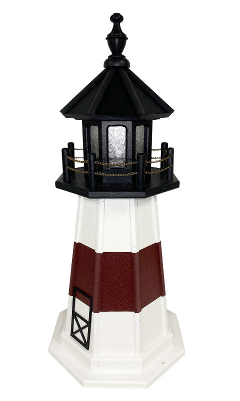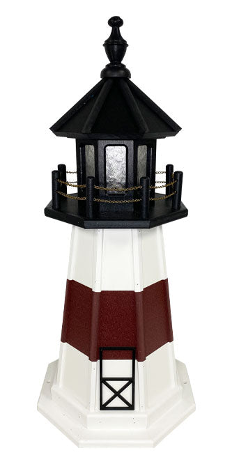 Bring a brilliant, historical accent to your landscaping using this Amish Cherrywood and White Recycled Plastic Lumber Montauk Lighthouse. Placing a light source in your garden not only showcases a few favorite plants; it also illuminates your love of seaside architecture and creates a thematic yard. This hardy piece recreates the famous Montauk Point Lighthouse in Long Island, New York, thanks to its white, maroon, and black hues and top, working light. A few window and door frames dot the body for added realism, their black tone matching the significant, top beacon. A working lightbulb inside this top element is powered handily by a 5.5' long electrical cord, and clear plastic panels between the black uprights allow it to shine through your yard. The wide base sits perfectly on your patio, in your sunroom, or within a flowerbed, and two holes on the flared base allow you to use anchors (not included) for an added layer of stability. Built of durable recycled plastic lumber, the frame lasts for seasons of service without peeling or splintering, and the top removes for cleaning the clear plastic or changing the bulb. Make a historic statement in a corner of your lawn using this Cherrywood and White Montauk Lighthouse. Some assembly required. Made in the USA.