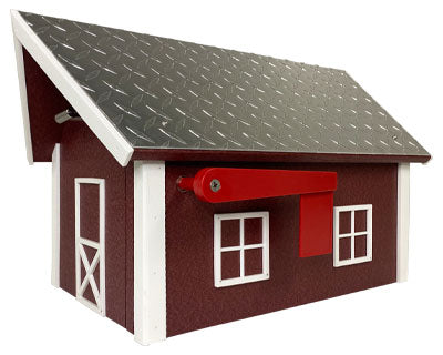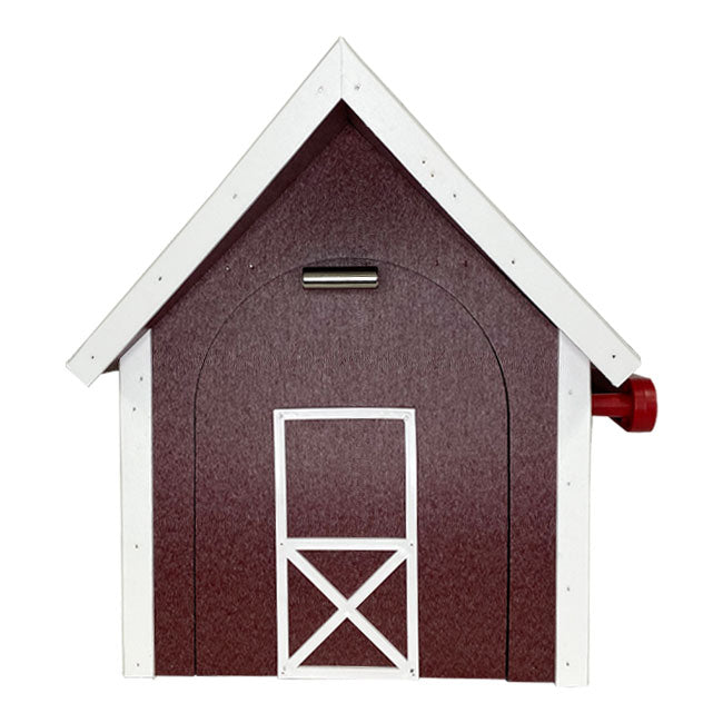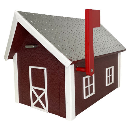 Make your mailbox a reflection of your penchant for rural architecture with this Cherrywood and White Amish Recycled Plastic Deluxe Mailbox. The dark red body, white trim, and metal clad roof combine on this item to wonderfully mimic a barn, while its recycled plastic lumber construction forms a lasting receptacle. Its generous interior holds plenty of mail, including small packages or catalogs, and the arched door has a magnetic connection to remain securely closed. The white window and door frame shapes offset the deep red body, and a chrome finish on the diamond plate metal roof provides a bit of shine. A bright red flag attaches to the exterior of the mailbox, completing the piece, and its flat base can be attached to a wooden 4 x 4 post or adapter (not included) for a traditional display. The poly body withstands exposure to the elements without warping or peeling, and the colors remain bright and visible for seasons of service. Accent the classic architecture of the countryside with this Cherrywood and White Amish Recycled Plastic Deluxe Mailbox. Made in the USA.