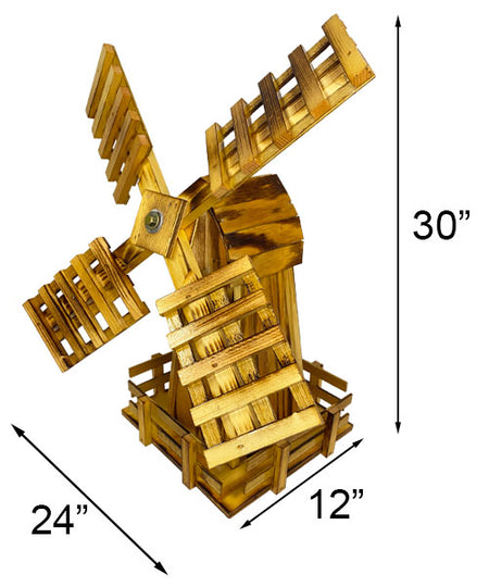 Transform your flowerbed into a serene miniature farmstead by adding this Amish Small Wooden Windmill to it. These structures have been used for millennia to mill grain or harness wind power, and this detailed piece brings charm and movement to your yard in moments. Its four sided body flares outward for a stable statue, and a rectangular platform surrounds the lower part of the mill for fantastic width. A gambrel style roof tops this structure, perfectly holding the two included, 24" long sails. Bearings allow these blades to readily spin in a breeze, and their slightly angled design helps capture wind for a fantastic effect. A clear, polyurethane coating atop the natural wood body keeps the item protected from elemental wear, while the natural grain and color variances in the body remain wonderfully visible. Place this item on your patio or deck, or use the included anchors through the two bottom eyebolts to secure it in your flowerbed. Showcase classic architecture and amazing wooden craftsmanship in your yard with this Small Wooden Windmill. Some assembly required. Made in the USA.