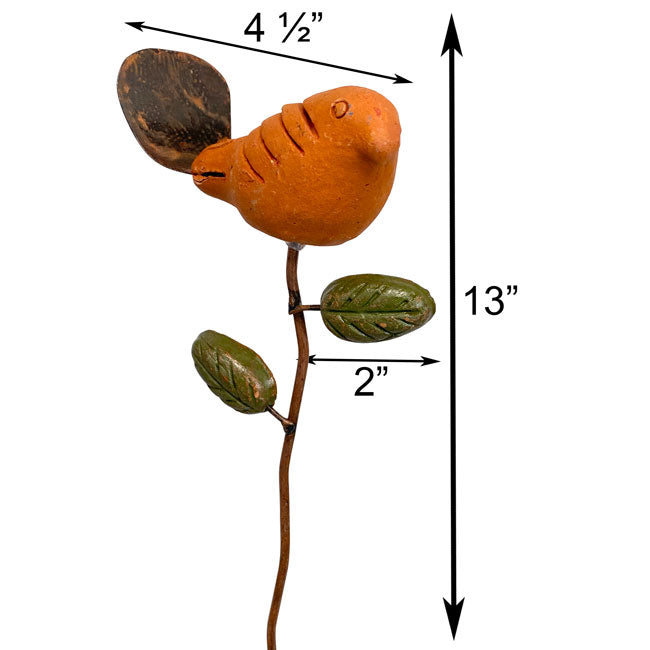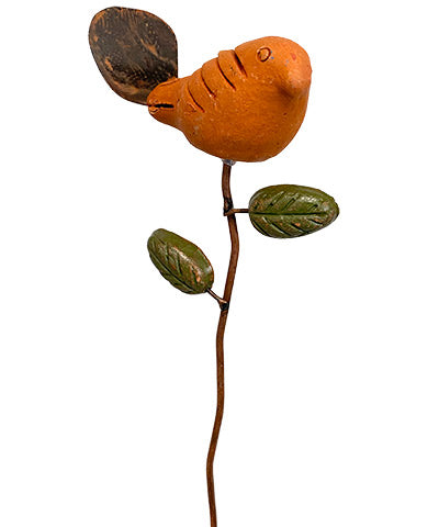 Add a bit of bright color and fun design to your potted plant using this Ancient Graffiti Spice Bird Plant Pick. This charming, ceramic figurine is fantastic for adding to a potted plant, offering bold color and a celebration of wildlife, while discouraging some birds from nesting. The 11" long, metal shaft inserts easily into garden soil, and two clay leaf shapes at the top enhance your plant. The orange toned, ceramic bird figure adorns the top of the stake, and its upwardly curled, metal tail completes the unit. Its natural materials showcase your love of the environment, and lend style to virtually any sized potted plant. It also acts as a barrier, often preventing wild birds from roosting in your plant. Create a focal point in your favorite herb or flower by adding this Spice Bird Plant Pick to it.