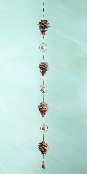 Showcase evergreens in your yard or home easily using this Ancient Graffiti Flamed Copper Colored Pine Cone Decorative Hanging Chain. This fantastic line of four, metal pine cone shapes lends natural style to your setting, while a bell between each cone provides gentle sound. The tapered shape and multitude of layers on each pine cone add realism to them, and a chain between these and each bell creates a connected piece of artwork. A 2.25" diameter, metal ring around each bell brings further shape and style to this piece, while its brown tones enhance the natural look. Use the included hook to hang this adornment from a bracket or branch, to create wonderful sound in your garden or home. The metal construction remains durable for many seasons, and the classic color scheme celebrates the outdoors. Add a hint of evergreens to your home or yard with this Flamed Copper Colored Pine Cone Decorative Hanging Chain.
