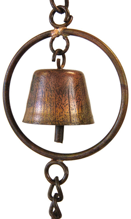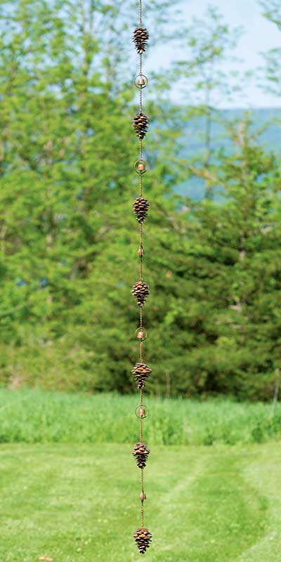 Bring evergreen style to a corner of your home with this Ancient Graffiti Pine Cones and Bells Rain Chain. Using this striking chain in place of a downspout lends a unique look to your home, as well as adds gentle sound to the setting. Seven intricate, metal pine cone shapes create a line, while bells within rings rest between them, and a chain connecting each element completes the piece. The wealth of brown hues meshes with the outdoors, and the flamed finish adds dimension. This chain is fantastic for helping direct rainwater in bold ways, taking the place of a downspout. An included gutter clip installs into the opening on your gutter, and a hook at the top of the chain allows you to suspend it easily. Its generous, 100" length fits on many different homes, and the chain links may also be removed for versatility. The metal body remains durable and beautiful for several seasons, while the pine cone motif celebrates nature. Stylishly direct rainwater using this Pine Cones and Bells Rain Chain.