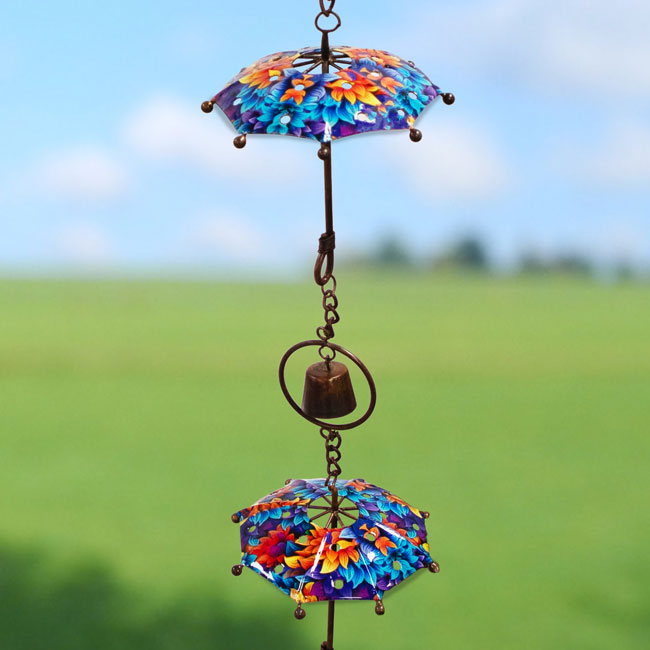 Upgrade a downspout with bold color and fun, floral shapes with this Ancient Graffiti Floral Print Umbrella and Bell Rain Chain.