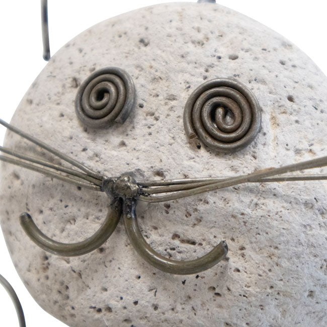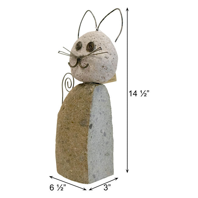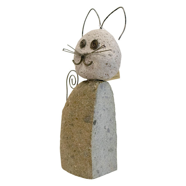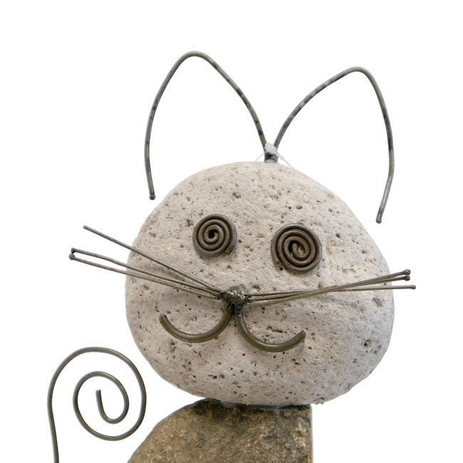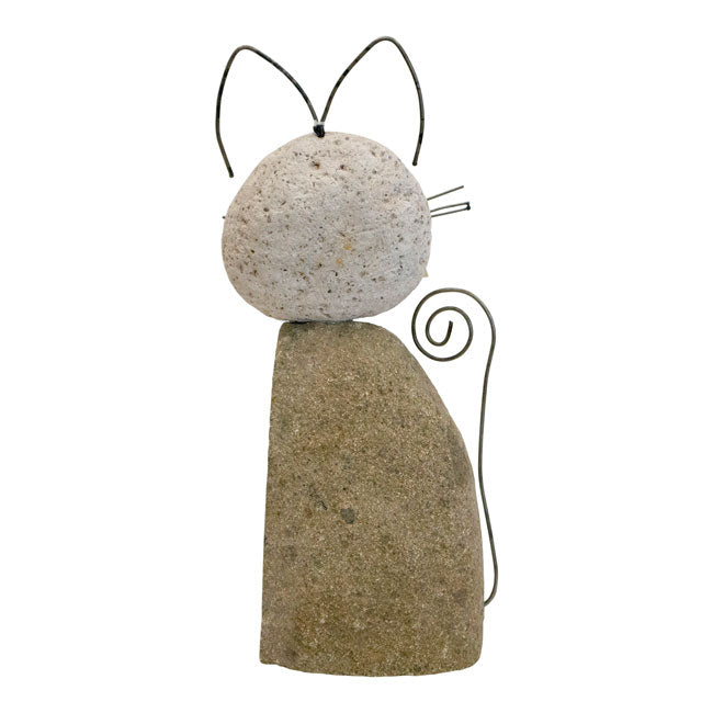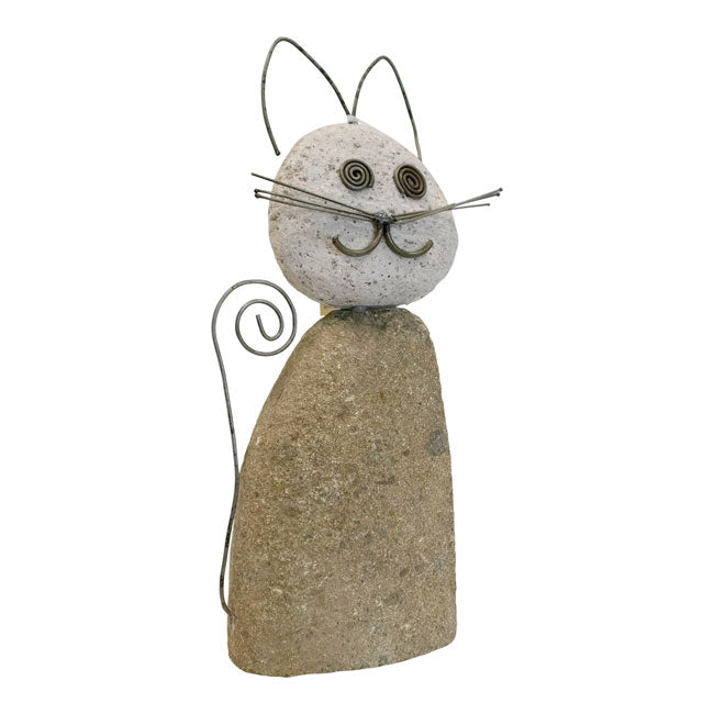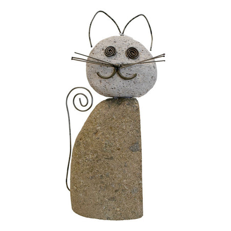 - Handcrafted statue made of river stones resembles a lovable cat figure