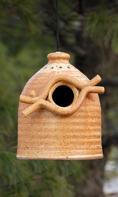 Create a dramatic roost for birds in your garden with the Anthony Stoneware Bird House. Two large rods encircle the entrance hole, adding interest to the home and offering birds perching room. The house is formed of clay rings that taper as they reach the top, bringing texture and movement. Ventilation holes surround the top of the home, and three large holes at the base help water drain and keep the nest dry. The 1.25" diameter entrance hole is perfect for small songbirds. A removable plug at the bottom of the item allows it to be cleaned easily, and the included black fabric cord enables it to be hung. The tan color with brown speckles adds a natural feel. This home is handmade from ceramic and then fired to 2400° Fahrenheit, to create a durable vitreous product that will withstand the rigors of time. The item will not decay, fade, or break down after exposure to UV light, for a long lasting unit. Enjoy birds in your garden with this Bird House. Made in the USA.