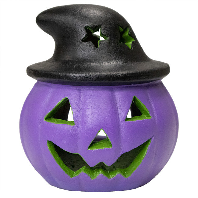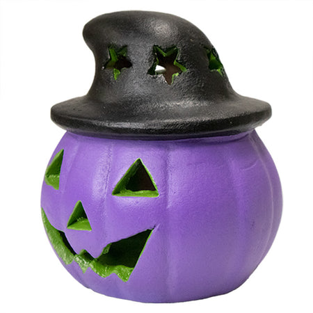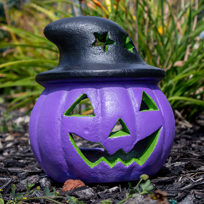 Bring dazzling, seasonal light to your garden path or patio while celebrating the Halloween season in spooky splendor with this 4 Seasonal Trends Purple Artisanal Jack-O-Lantern with Witch Hat Luminary. The bodacious, purple and green tones of this terra cotta unit provide a fun and ghoulish upgrade to your front porch or deck's décor, giving you a standout Halloween accessory. A black hat tilts to the left and sports a circular brim while sitting atop the pumpkin figurine, establishing the fun and witchy motif, while star shaped cut outs here lend additional charm. Triangular eyes and a nose rest above a familiar, angular and pointy smile, and the luminary's rotund shape with impressed lines mimics a traditional pumpkin. A rich, purple finish on the body accentuates the seasonal appeal of this whimsical piece, and vivid green tones outline the openings of the eyes, nose, mouth, and hat to create a vibrant, audacious contrast. Place a candle inside the alluring, spooky piece through the generous, rear arched opening, letting you cast bewitching shadows across your lawn or walkway. The stout, level base makes it simple to rest the piece on a table or your porch as it illuminates your yard. The unit's handmade, terra cotta construction lasts for several frightful seasons of service, and the purple and green paint tones will remain eye-catching and vibrant. Spotlight spooky colors and create spellbinding light and shadow on your property for Halloween with this Purple Artisanal Jack-O-Lantern with Witch Hat Luminary.