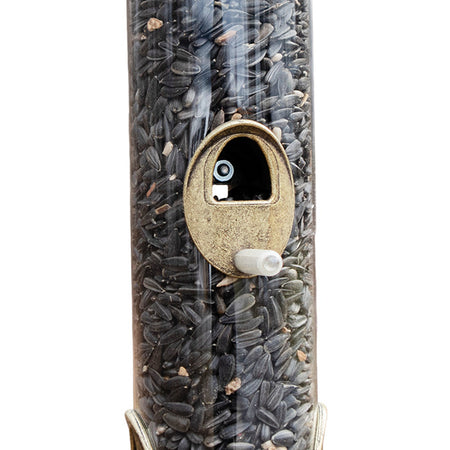 Attract a variety of hungry songbirds to your bird sanctuary and give them ample nourishment in this Aspects Medium Antique Brass Seed Tube Wild Bird Feeder. This striking feeder's antique brass tone will provide a wonderful and eye-catching embellishment to your landscaping, and it contains four handy ports, each with their own perch to let multiple birds feast at once. Each port is reinforced by metal, ensuring they remain intact for seasons of reliable service, and the clear, UV stabilized polycarbonate tube holds 1 quart of mixed seed or sunflower kernels while keeping the feed level clearly visible at all times. An internal seed baffle at the base of the unit seamlessly directs seed to the two bottom ports for even distribution, allowing the feeder to empty completely without leaving a dirty residue. The innovative Quick-Clean base is simple to remove; just squeeze the two black plastic tabs to allow the feeder to be emptied quickly and cleaned completely. The sturdy die-cast metal cap slides up the hanger to facilitate additional seed fillings and comprehensive cleaning, while the classic, antique brass tone of the unit instills your birding sanctuary with vintage charm. Durable construction makes this a faithful feeder that will remain staunch throughout repeated outdoor use, and the attached metal loop hanger lets you suspend the handy item from a branch or hook. For variable showcase, pole mount the piece using a 3/4" threaded adapter (not included). Create a fantastic and nutritious haven for various songbirds on your property with help from this durable, attractive, Medium Antique Brass Seed Tube Wild Bird Feeder. Made in the USA. Lifetime guarantee.