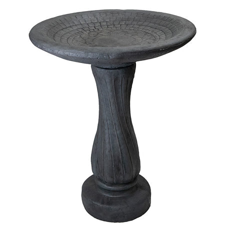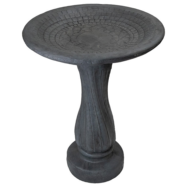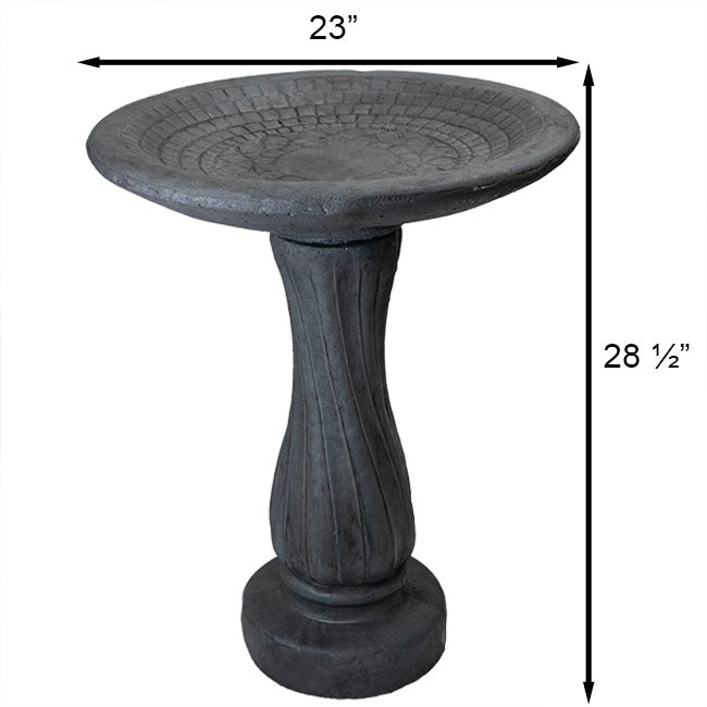 Rejuvenate your landscaping with timeless elegance and striking lines by placing this Athens Indigo Spiral Standing Bird Bath and Pedestal in it. This stunning, functional piece of outdoor decor will certainly bring beauty and birds to your outdoor sanctuary, while remaining durable during the warm months thanks to its concrete construction. A 23" diameter basin sports impressed lines throughout it, evoking a mosaic and providing both visual interest for you and texture for small songbirds. It also gently slopes to 2.25" deep, allowing many sizes of backyard bird to perch and preen. This sturdy basin attaches easily to the included, concrete pedestal, which has vertical curved lines along it for a moving effect. Its 11" diameter base provides stability, and an extended neck atop this piece creates a secure connection with the sleeve on the bowl's underside. A soft indigo glaze enhances the aquatic purpose of the item, and the adornment stands at just the right height for birds to safely access it and you to watch them. Its high quality, concrete construction withstands use throughout the warm months, and the bowl can be inverted in the winter for protection from freezing. The varied textures and blue hues on this item are sure to bolster the hues in your flowerbed, and add a touch of sophistication to the area. Make your garden a haven for birds and enhance its beauty with this Indigo Spiral Standing Bird Bath and Pedestal. Some assembly required. Made in the USA.