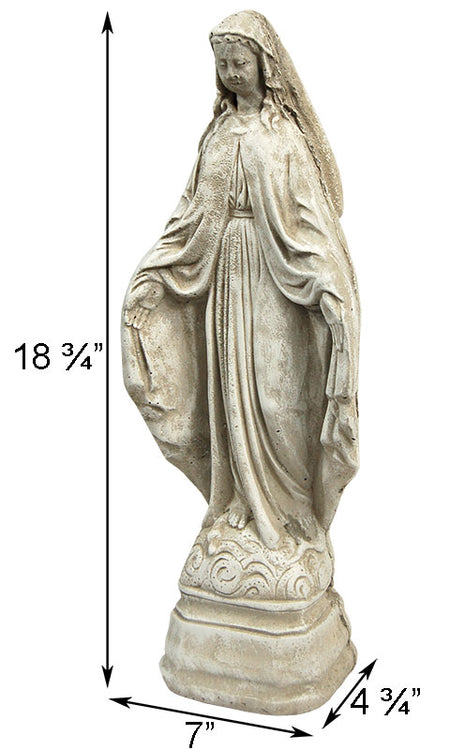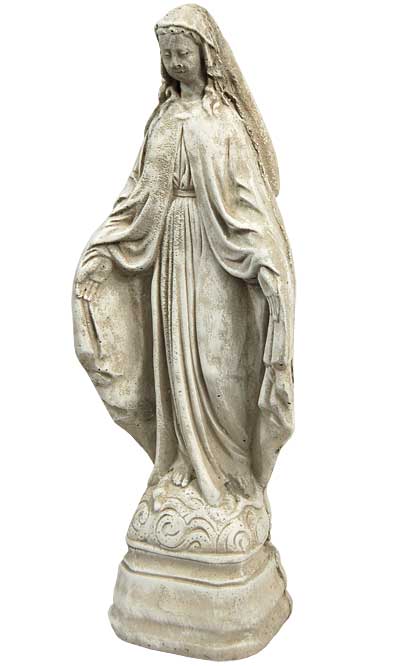 Imbue your landscaping with divine style using this Athens Marble Tone Tiny Mary Statue. Placing this highly detailed figure in your yard showcases your faith, while celebrating good triumphing over evil. Her downward cast head, outstretched arms, and long robe lend a classic silhouette to this piece, and one bare foot peeks out from beneath the robe. She is shown stepping on a serpent, which represents virtue overcoming the devil. White accents above the gray base color mimic marble, furthering the heavenly effect, and a generous square pedestal supports the figure easily. Crafted from concrete, this statue is perfect for showcasing in your landscaping through the warm months, and is simple to move indoors during cold weather. Highlight your faith in your garden with this Marble Tone Tiny Mary Statue. Made in the USA.