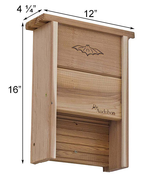 Give the bats in your backyard a place to roost by placing the Audubon Cedar Bat Shelter. With a single chamber large enough for 20 bats, this bat shelter is perfect for your small backyard colony. The interior surface and landing platform is made of rough cedar and is grooved to make it easy for bats to cling when roosting and landing. The single chamber measures 1 3/4" deep and the front panel features a 4.5" bat design burnt into it. This bat shelter weathers beautifully as it is made of red cedar and assembled with zinc-plated screws. The Cedar Bat Shelter also may be mounted using the included zinc-plated deck screws and pre-drilled holes or pole mounted using a pole and adapter (not included).