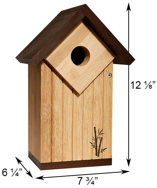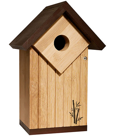 Help sustain both bluebird populations and natural resources using this Audubon Ultimate Renewable Bamboo Bluebird House. Unique detailing such as vertical impressed lines, an integrated predator guard, and overhanging roof create this classic shelter, and its size is specifically designed for bluebirds. Made of lasting bamboo, this nest box provides your feathered friends a durable and safe nesting area. A 1.5" diameter entry hole sits near the top of the shelter, surrounded by a wooden block which prevents predators from reaching into the unit. A dark brown, pitched roof with overhang directs water away from this opening, while a matching base completes the effect. Attach a mounting bracket to this base for placement on a post, or use screws (not included) through the predrilled holes on the back for affixing it to a wall or fence. Routed horizontal lines on the inside of the shelter help nestlings reach the entry hole, and the side panel opens for periodic nest checks. Made from bamboo, the home naturally deters water and insect pests, and this wood grows quickly and easily for an easily replenished material. The brown and tan hues showcase the beauty of wood, and a rendering of bamboo on the front of the unit adds a touch of style. Offer bluebirds a durable shelter by placing this Ultimate Renewable Bamboo Bluebird House in your garden.