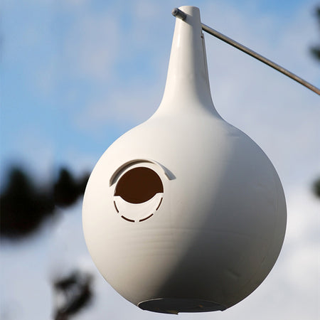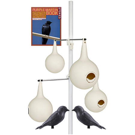Invite martins to colonize your acreage by placing this BestNest Classic Purple Martin Gourds and Pole Package in it. This bundle of gourds, a pole, decoys, and a book makes it easy to establish housing for these birds, and its straightforward design is great for a beginning martin landlord. The 4 Heath Two-Piece Martin Gourds each have a crescent shaped, 2.125" long and 1.375" tall opening, which can be altered to a 2.125" diameter round entry if desired. Their beige color keeps them cool during hot summer months, and two slots on the base offer a bit of drainage. A hole on the neck of each gourd allows you to slide them onto one of the rods of the Heath White Telescoping Martin House and Gourds Pole. This steel pole with a white, powder coated finish places the gourds at a significant height, and the modular brackets can be placed anywhere on the top section for versatility. This ensures your birds have plenty of space between them, deterring porch disputes. Attach the included Erva Purple Martin Decoys to the rods to better attract scouts, and read the included Stokes Purple Martin Book for thorough information on becoming a martin landlord. Build martins a fantastic nesting site using this Classic Purple Martin Gourds and Pole Package. Pole made in the USA. Assembly required.