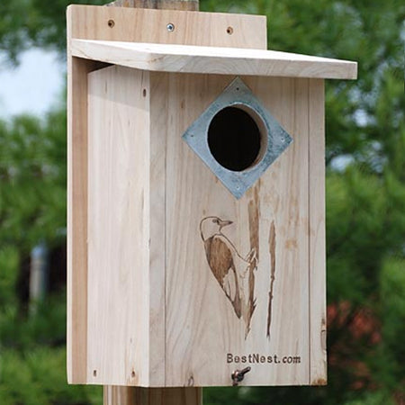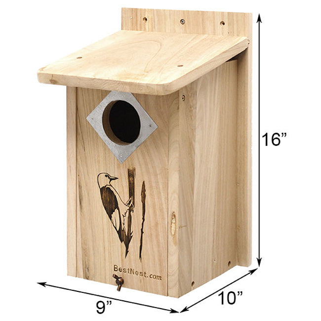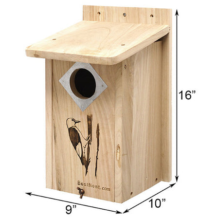 Offer a convenient home to a red-headed, hairy, or red-bellied woodpecker with this BestNest Classic Three-Woodpecker House. This shelter creates a perfect roosting spot in your area, for the delight of these cavity nesting birds. Every detail of this home is specifically designed for woodpeckers, to create a healthy and lasting home for them. The 2.5" diameter entrance hole is surrounded by a metal predator guard, to prevent it from being enlarged. The deep cavity keeps nestlings safe, as predators are not able to reach so far into the box. The overhang of the roof keeps the interior dry, while gaps in each corner of the base allow any excess water to drain from the nest. Two gaps in the top corners help ventilate the home for a healthy atmosphere. The front panel lifts upward for nest checks when needed, and a sturdy screw keeps the item closed. An additional wooden panel inside the home acts as a barrier to prevent nestlings from falling out when the door is opened. For more versatility, move the panel upward in the winter to close the house. The 0.625" thick wooden construction aids in insulating the home, and a rendering of a woodpecker on the front adds a bit of style. Use the predrilled holes at the top and bottom of the home to easily mount it to a post, wall, or tree. Provide a dynamic home to woodpeckers in your yard with this Classic Three-Woodpecker House.