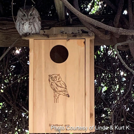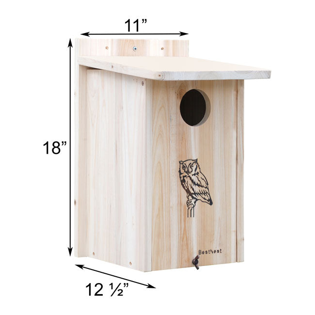 Offer birds of prey a safe and sturdy roost with the BestNest Premium Screech Owl / Kestrel House. Inviting these skillful hunters into your yard helps control rodent populations naturally, while allowing you to enjoy the beauty of different birds. This home is artfully designed to meet the needs of small owls or kestrels. The rectangular shape of the roost creates plenty of nesting space, with small openings on each corner of the base for drainage. The 3" diameter entry allows these birds passage, while remaining protected from the elements with the sloped roof and significant overhang. An image of a screech owl clinging onto a branch is burnt into the front panel of the home, for added design on the piece. Ventilation holes near the top of the shelter provide temperature regulation, for the comfort and safety of the nestlings, while a unique thumbscrew at the base of the front panel keeps the home securely latched. Open this panel for nest checks, or to move the included sliding baffle. This wooden panel rests within grooves on the sides of the home, and can sit at the bottom of the roost to protect eggs and nestlings during maintenance. At the end of the season, or if you opt not to house owls, slide the panel upward and use the included wooden tabs to keep it in place, blocking the entry hole. Securely mount this unit to a post or tree by drilling through the back and top lip. The wooden body adds a natural charm to the piece, and its durable hardware and beautiful image create a lasting roost. Give birds of prey a nesting option in your yard with this Premium Screech Owl / Kestrel House.