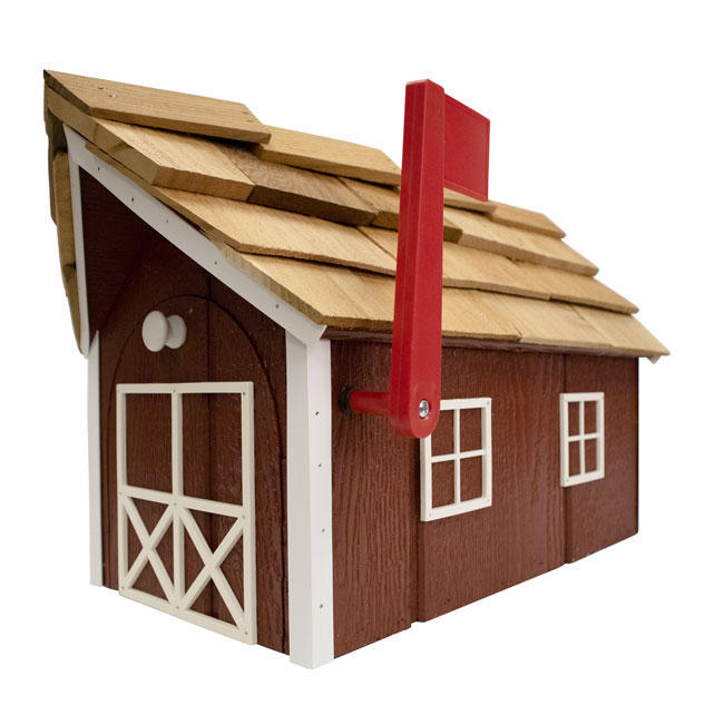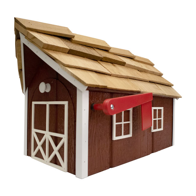 Bird in Hand Red Amish Made Barn Style Mailbox.
