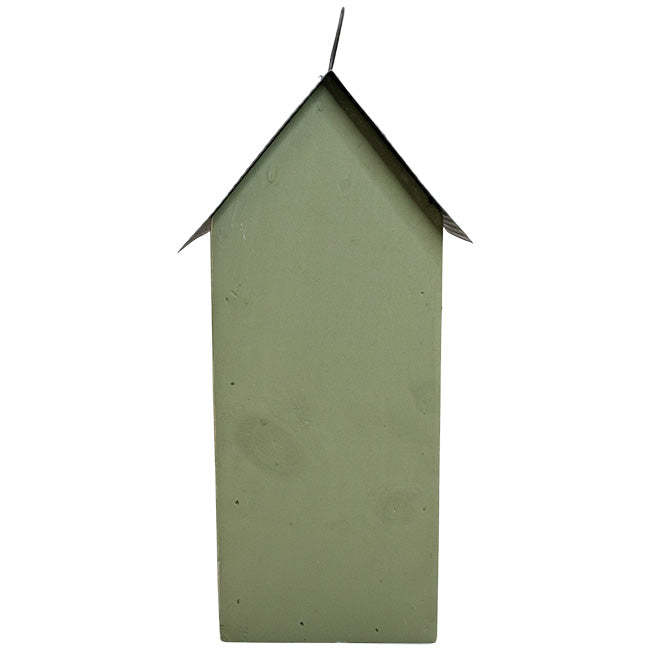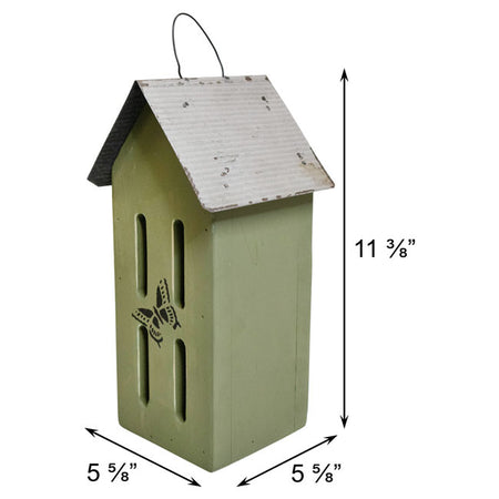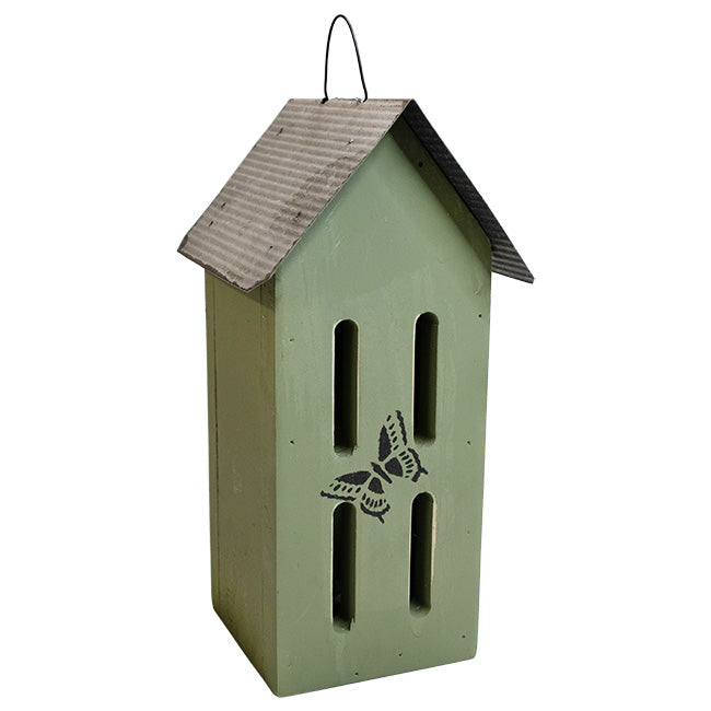 Provide wonderful butterflies a safe and comfortable dwelling during cold and inclement weather by offering them this enduring Bird In Hand Amish Made Green Butterfly House with Stenciled Design. This lovely domicile sports a rustic green tone and unembellished, pitched metal roof to lend your backyard birding area a familiar and bucolic charm as you give shelter to butterflies during periods of migration or harsh weather. A stenciled image of a butterfly adorns the front of this abode, accentuating the quaint, green piece with delightful and whimsical appeal, while ample space inside the unit’s classic, rectangular design gives butterflies plenty of room to comfortably reside. Four oval slats on the front panel of the home allow these graceful pollinators easy access to the interior when they seek shelter, and the expansive, pitched roof provides durable and reliable coverage from the elements to the butterfly inhabitants. A metal hanging loop atop the timeless roof allows you to place this beautiful and sturdy accent on a hook in your garden; alternatively, the unit may rest on any flat, level surface while also including a hole in its base for dowel mounting. Ensure that your local butterfly population thrives by giving them safe and comfortable housing with this Amish Made Green Butterfly House with Stenciled Design. Made in the USA.