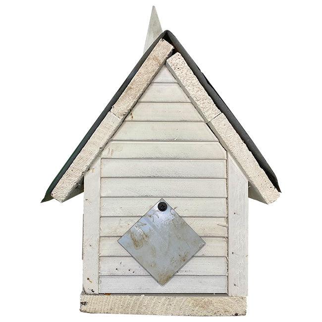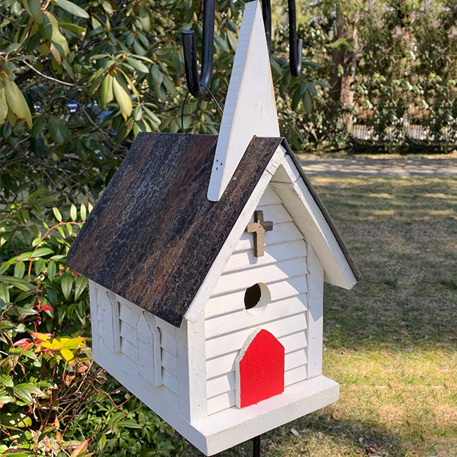 Add a hint of the sacred to your yard with this Bird In Hand Amish Made Cameron Country Church Bird House. Masterfully crafted by the Amish in eastern Pennsylvania using reclaimed and recycled barn wood and with an entry hole of 1.25" diameter, this bird house is perfect for chickadees, finches, titmice, and wrens. Constructed in the image of a church, the house conveys a sense of awe with its stately scale model red doors, holy cross, and majestic steeple which adds even greater height to the piece. A convenient small metal panel on the back of the house slides open to reveal a 2" diameter hole for nest inspection and cleaning while keeping out unwanted visitors. Small gaps under the roof and walls of the church provide ventilation for the inside of the house. The pitched roof is enhanced with sheet metal for durability and overhangs the entry hole, helping to keep the roosting birds inside dry. A wire on top of the house makes hanging the piece simple, or the flat base can accommodate a mounting plate for displaying on a pole or post. The recycled and reclaimed wood construction lends it an environmentally friendly air. The birds in your yard will exclaim "Hallelujah!" when they see this Amish Made Cameron Country Church Bird House. Made in the USA.