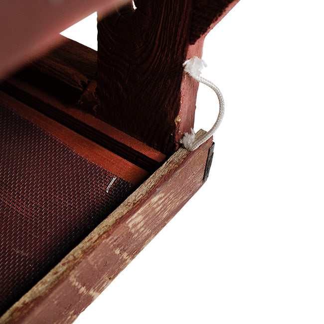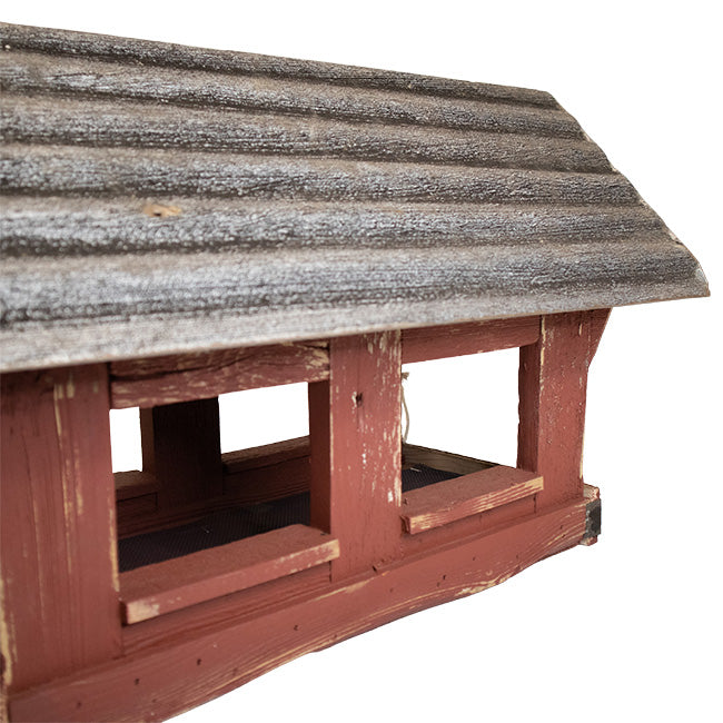 Showcase your love of birding in colorful, rustic flair with this fantastic Bird In Hand Amish Made Red Covered Bridge Bird Feeder. This substantial, beautiful feeding unit is constructed from Amish made, reclaimed materials, and expertly evokes the familiar covered bridge motif to instill your backyard sanctuary with bucolic charm. The red, wooden body makes for a colorful and staunch station, and the ample height and rectangular shape lend timeless appeal to your haven; lighter tones throughout the wood accentuate the classic qualities of this generous feeder, and sheet metal on the pitched roof helps protect the feed from rain. A rectangular, screened base holds 1 quart of mixed seed for a helpful offering of sustenance, while the four open sides entice birds to visit and dine with its fly-through design. For protection from rain and outdoor elements, the sheet metal on the item’s pitched roof helps redirect the water away from the unit for a clean dining locale. Attract a variety of hungry birds to the unit by placing fruit, seed cakes, or suet on the convenient platform, a brilliant way to beckon all types of feathered friends to your feeding station. One wooden slat on the end of the bridge easily lifts, letting you gain access for refills and maintenance, while a cord ensures this piece remains securely attached. Showcase this Amish made, red feeder on a post using its included, 5.5" x 5.375" mounting plate to provide a splash of color and rustic appeal to your bird garden. Reclaimed wood and metal construction create a reliable dining hotspot that you can enjoy for multiple seasons as it imbues your outdoor space with classic, understated allure. Combine your passion for birding with old Amish style by placing this Amish Made Red Covered Bridge Bird Feeder in your yard. Made in the USA.