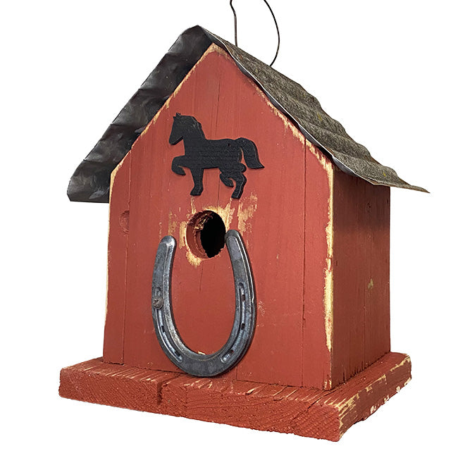 An equestrian presence gallops into your yard or garden thanks to this Bird In Hand Amish Made Red Huntington Horseshoe Bird House. Constructed with reclaimed and recycled wood by seasoned Amish craftspeople in eastern Pennsylvania and featuring a 1.25" diameter entry hole, this bird house is perfect for small birds like wrens and finches, as well as for any environmentally conscious birder. Painted a cool red and purposely distressed for a weathered look, this piece is evocative of an aged barn complete with a small black horse silhouette above the entry hole and a small, authentic horseshoe just below the hole. The slanted, aged sheet metal roof overhangs the entry hole and enhances the rustic charm while providing protection from the elements to the inhabitants of the house. The back of the house features a sliding metal panel which covers a 2" diameter hole, which allows for convenient cleaning of the house and observation of any roosting birds. The wire hanger on top of the house makes hanging the unit simple; alternatively, its wide base allows for use of a mounting bracket (not included) to place it on a post. Add a pastoral flair to your yard while providing shelter for your bird friends with this Amish Made Red Huntington Horseshoe Bird House. Made in the USA.