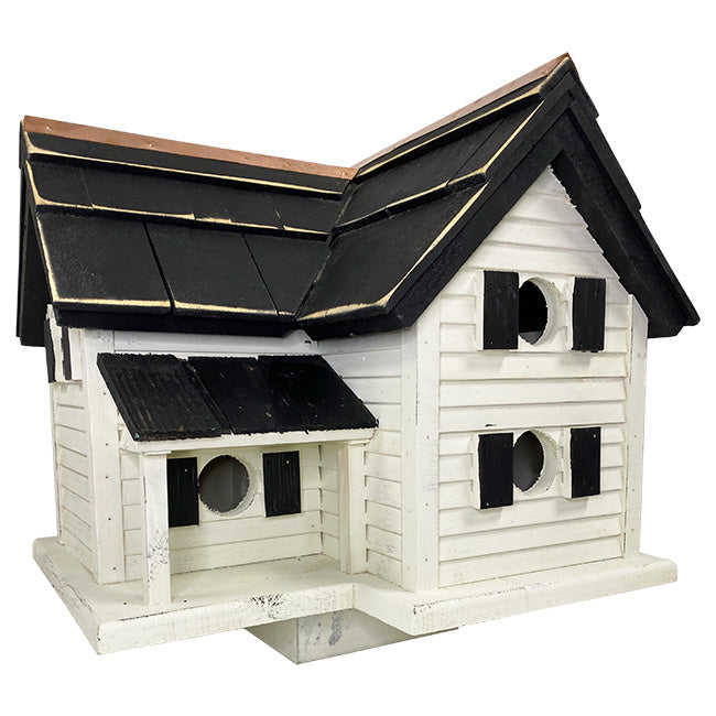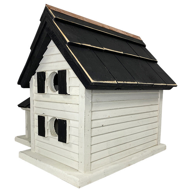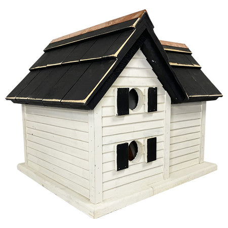 Invite purple martins to reside in exquisite style with this Bird In Hand Amish Made Montgomery Purple Martin House. Hand crafted with reclaimed and recycled Amish wood, this substantial bird house is soundly built while offering a charming, natural sensibility to your yard. The 8-room shelter is reminiscent of a traditional, white two-story house, replete with wood siding and black blocks positioned beside the half dozen, 2" diameter entry holes to approximate classic window shutters. The pitched roof's black tone and copper colored ridging pleasantly contrast the white walls and overhangs each of the entryways, keeping roosting martins dry while also remaining easily removable for nest checks and cleaning. Gaps below the roof add ventilation, and an integrated bracket on the bottom of the home makes for easy mounting on a standard 4 x 4 wooden post (not included). Each home is deliberately distressed to provide a more weathered appearance, bolstering its rustic charm, and the white coloring appeals to martins while keeping the compartments cool in the summer heat. Boost your yard's natural beauty and beckon purple martins to stay year after year in this Amish Made Montgomery Purple Martin House. Made in the USA.