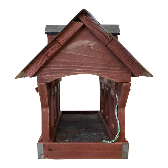- Design evokes a classic covered bridge's appearance, giving charming, pastoral style in the bird garden