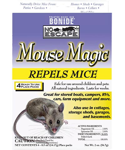 Keep mice away from your home, garage, or boat in a natural way with the Bonide No Escape Mouse Magic Repellent. This all natural repellent uses peppermint and spearmint oil to trigger an avoidance or escape response in mice, for a humane product. The four convenient, 0.5 ounce packages are designed to be placed wherever you see mouse activity, particularly next to walls and near entry holes. One package is often effective for an average sized room, and lasts for approximately 30 days. The product will not harm lawns or gardens, and may even be used in areas where children and pets play. Prevent mice from infesting your home or garage with the No Escape Mouse Magic Repellent.