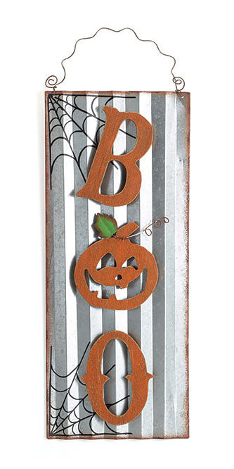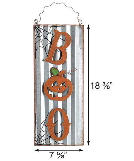 Welcome your favorite holiday on your door or against a wall with this Gray and Orange Boo Tin Wall Art. This charming accent brings a familiar and fun look to any setting, celebrating Halloween in moments. A rectangular piece of corrugated tin creates the base, and its gray tone lends a rustic hint. Spiderweb accents on two corners enhance the aged appeal, completed by a distressed finish on the edges. Wooden letters form the word "Boo" vertically, with a jack-o-lantern forming the center "o" to bolster the Halloween motif. A green leaf lends extra color to the piece, while a brown vine here matches the wavy hanging wire. The hardy construction and convenient size makes this item perfect for use in the home or outdoors, and the traditional colors and shapes capture attention in moments. Bring surprising Halloween style to any wall with this Gray and Orange Boo Tin Wall Art.