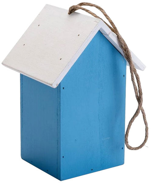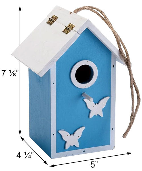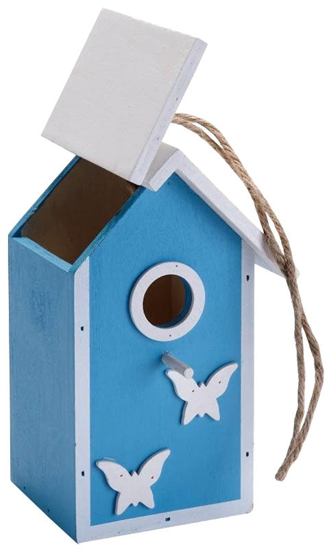 Decorate your yard while providing safe nesting to your local birds when you hang this Blue Butterfly Skies Bird House in it. This charming single bird house features a 1" diameter entrance for small birds making a home within while keeping out larger birds and animals. Small hinges on one side of the roof make for easy access to the interior for cleaning, while an attached rope loop provides straightforward hanging. The home's color scheme accents your garden by contrasting any greenery with its white roof and trim and its soft blue walls. Two white butterfly silhouettes ornament the house's front panel beneath a 1" long white perch. Constructed of sustainably sourced wood, this pleasing roost is long-lasting, making for a reliable and durable home for many seasons to come. Move birds into your garden by enticing them with this Blue Butterfly Skies Bird House.