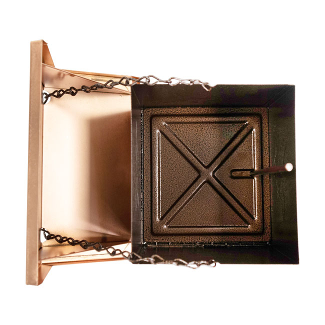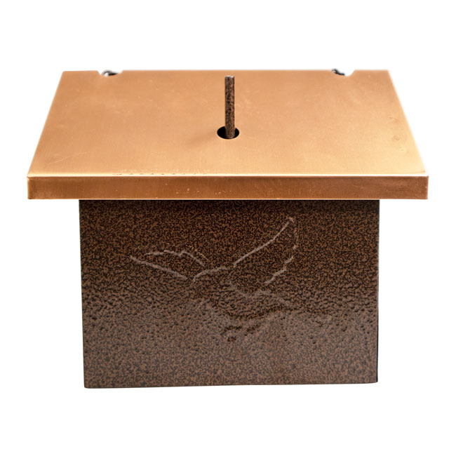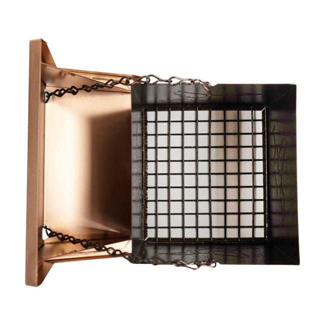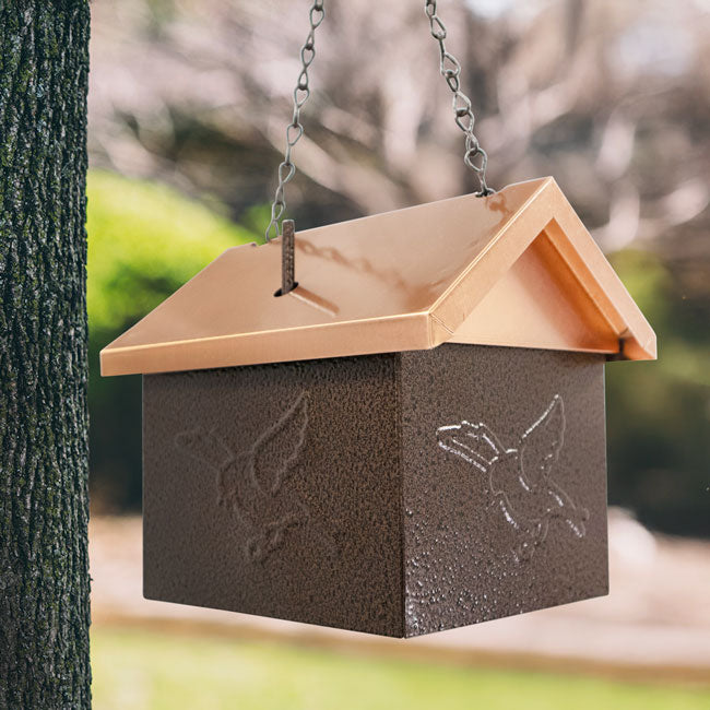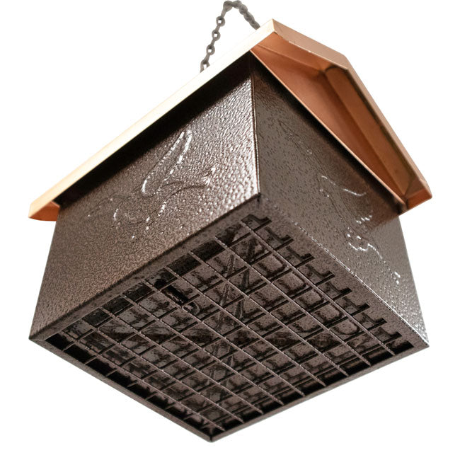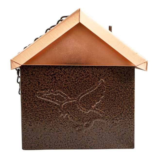 - Copper colored, pitched roof covers this feeding chamber