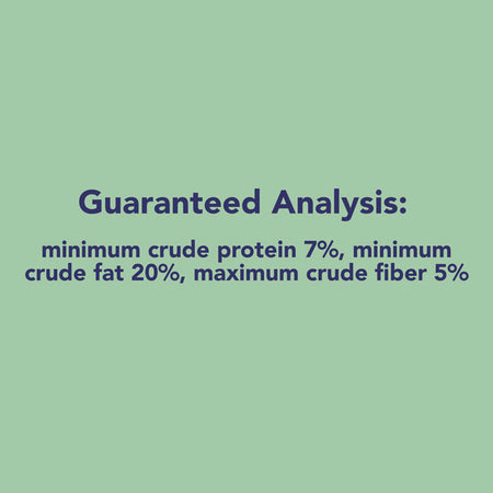 Guaranteed Analysis: minimum crude protein 7%, minimum crude fat 20%, and maximum crude fiber 5%