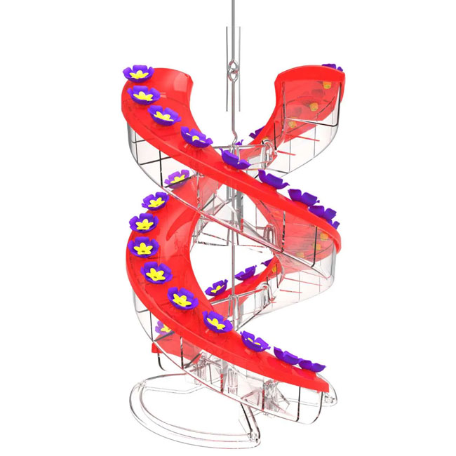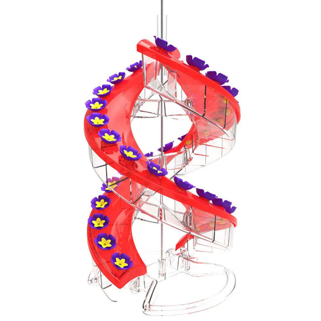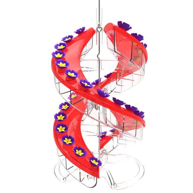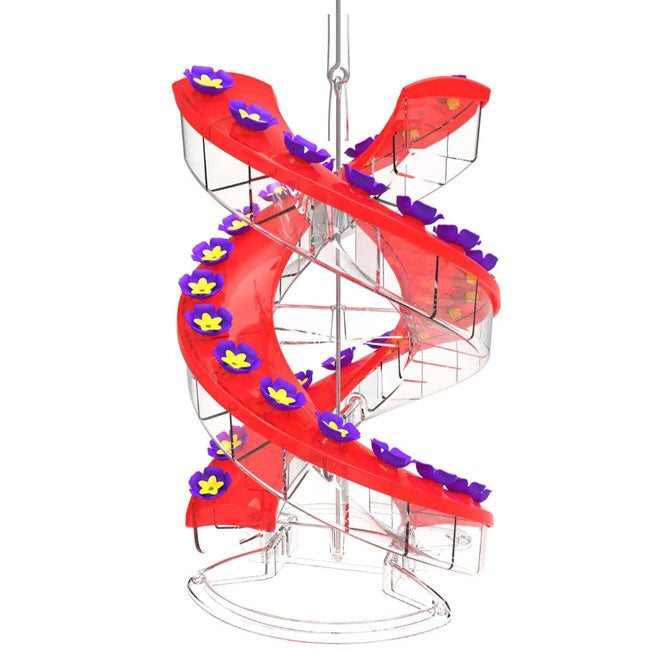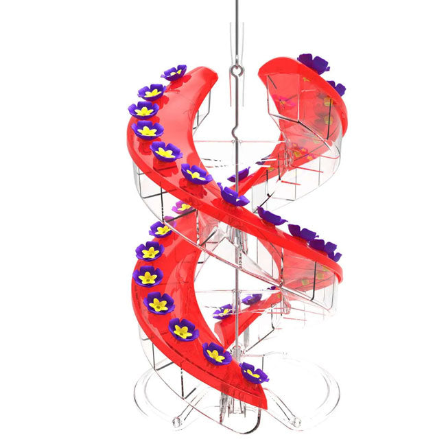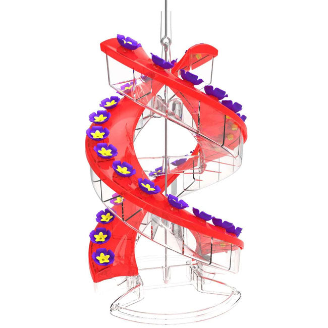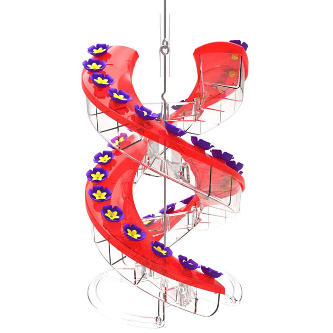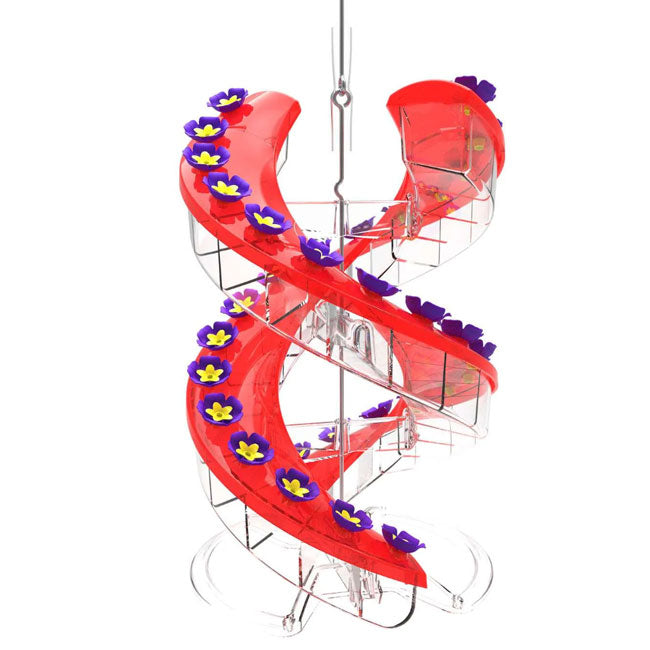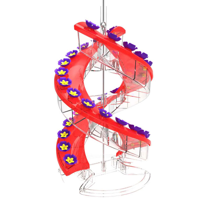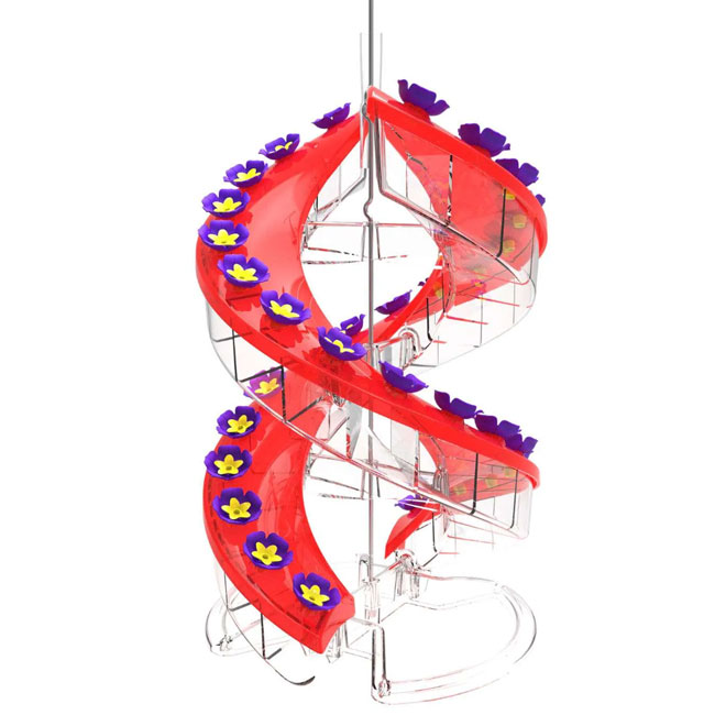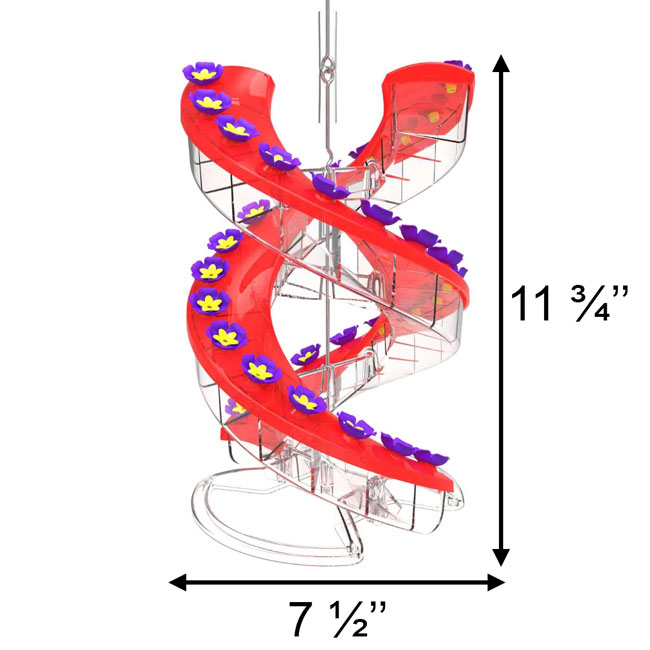 - Offset, spiraling design creates natural feeding positions, allowing several hummingbirds to dine at once