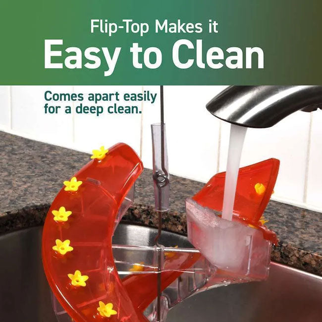 - Translucent, red lid covers each port and holds the yellow feeding flowers in place