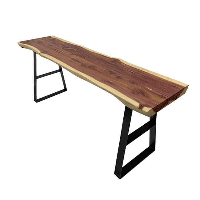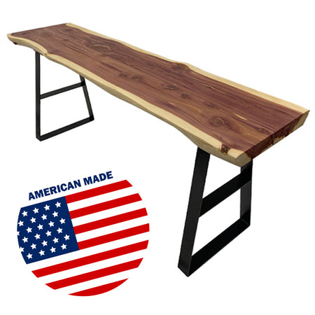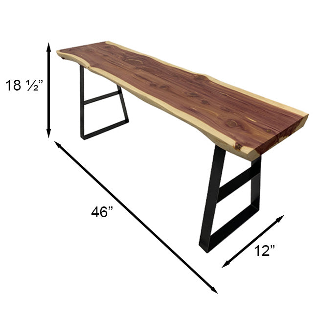 Admire artisanal craftsmanship and enjoy a charming seat on this gorgeous Cedar Live Edge Bench and Legs by Prime Retreat. This bench is crafted from robust, natural wood sourced from the Mark Twain National Forest and upcycled from remnants of the lumber industry, making this item both stunning and ecologically friendly. The slab's sensational reddish hue and natural cedar construction blend wonderfully together for a truly appealing appearance, and the piece is protected with a coat of polyurethane for a brilliant, striking finish. Due to their natural, one of a kind construction, each of these slabs will be unique in their appearance regarding knots, curves, and grain, and the color may have slight variation from piece to piece. This spacious bench measures 46" long and 12" wide, sporting ample room for you to have a comfortable seat and enjoy its durable construction. Included is a pair of coated, premium steel legs crafted in the Midwest, which firmly support the cedar slab and are unparalleled in quality and reliability, while included hardware makes the minimal assembly an easy task. An additional horizontal tab on top of each leg adds further stability in comparison to similar items, making this a particularly sturdy accent for you to place on a level surface and enjoy in quaint comfort. Celebrate the natural beauty of American made cedar and magnificent craftsmanship with this Cedar Live Edge Bench and Legs. Some assembly required. Made in the USA.