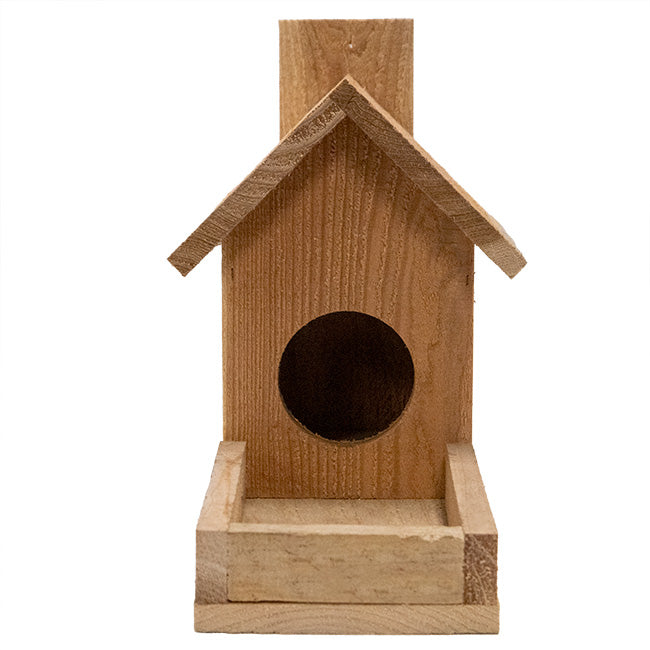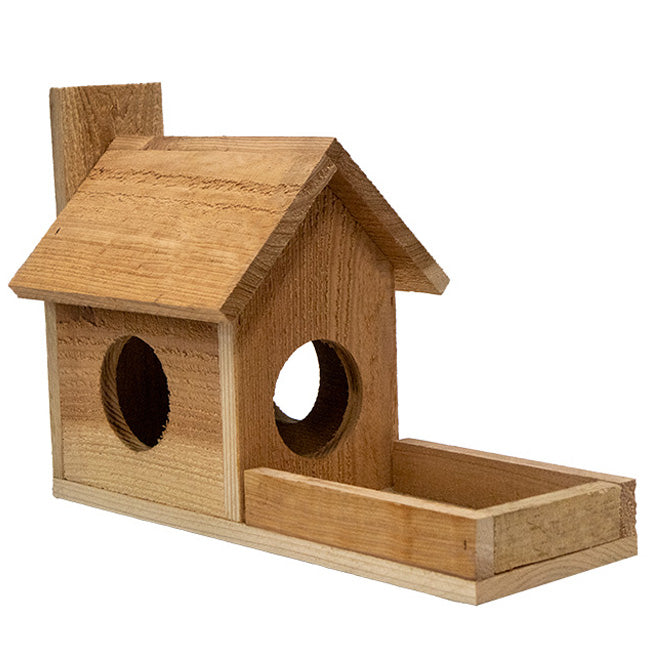 Turn your backyard into a rustic squirrel sanctuary by adding this Cedar Squirrel Feeder by Prime Retreat to it. This robust, cedar frame brings familiar shape to your backyard, while helping squirrels remain well-fed. A front, extended platform supports a standard peanut butter jar or other, 32 ounce canning jar (not included), with its mouth aligning with the 3" diameter cut out on the sheltered back section. The platform can also hold 0.6 quarts of cracked corn, peanuts in the shell, or other seed, and additional, 3" diameter openings on either side of the protected area allow squirrels to easily enter the feeder. The pitched roof here creates a cozy and dry dining spot, for the animals to comfortably snack on the peanuts, bread, or peanut butter you add to your chosen reservoir. Crafted of lasting cedar, this feeder will remain durable and resistant to rot for many seasons, and its rough hewn finish celebrates its natural body. A back tab with a predrilled hole swings upward for placement against a flat vertical surface such as a wall, post, or tree, or its level base can rest on a table or deck rail for a different display. Engage squirrels' natural curiosity and foraging behaviors by placing this Cedar Squirrel Feeder in your garden. Made in the USA.