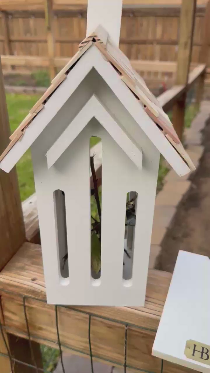 Offer beautiful butterflies traditional shelter in your garden with this Classic White Butterfly House by Prime Retreat. Many of these captivating insects hibernate through the cold winter months, and also require a refuge during summer rainstorms. This striking, white home fantastically meets these needs, creating spots for butterflies to hide from predators, stay dry, and rest. Three elongated slots on the front panel mimic crevices in wood piles or bark, which butterflies often use for protection. A pitched roof covers the roost, with wooden shakes on it for added design. A hanging tab on the back of the unit makes it simple to place it on a post or against a wall, while the flat base allows it to attach to a pole with a mounting bracket (not included). The back panel removes from the home, enabling it to be filled with twigs and leaves for added hiding spots. The crisp white paint enhances any setting, and the wooden construction creates a safe haven. Provide butterflies refuge in your yard with this Classic White Butterfly House.