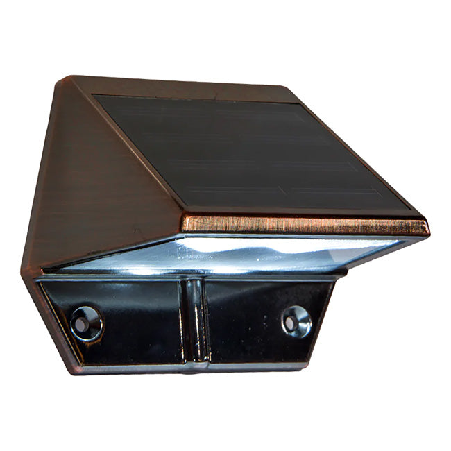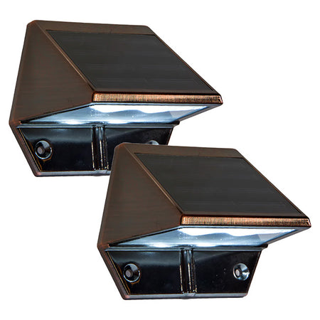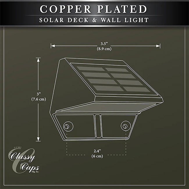 Provide staunch and expansive illuminative coverage to your railing or outdoor setting with the convenient and amazing Pack of 2 Classy Caps Copper Plated Deck and Wall Lights. This pair of durable lights provides elegant and modern appeal to your yard, letting you light up your surrounding area in luxurious style. These wonderful and eye-catching fixtures sport an antique, electroplated copper finish for maximum visual appeal, and can be easily situated wherever you need to shed light on your personal property. Set them up on your patio, deck, stairway, garden, and more for a downward cascade of brilliant, white light. These high performance solar lights remain lit for up to 12 hours once activated, harnessing the sun's power to lend you a convenient, wire free source of exterior illumination, and each unit utilizes a pair of high output surface mount LEDs to cast bright, white light over your outdoor space. For superior convenience, these pieces turn on automatically at night, letting you enjoy their functionality with minimal input, while an on/off switch lets you customize the lights' use to your personal needs. A single, long life AA Ni-MH rechargeable battery is included with each light, while the quick and simple installation allows you to set up these excellent lighting fixtures all by yourself with minimal effort. These eye-catching, dazzling, copper toned sconces provide a luxurious way to control the lighting on your property in an ecologically-friendly and intuitive way, with each light producing a robust 12 Lumens of illumination. Give your outdoor lighting setup a solar boost and enjoy the arresting appeal of this Pack of 2 Copper Plated Deck and Wall Lights. One year limited warranty.
