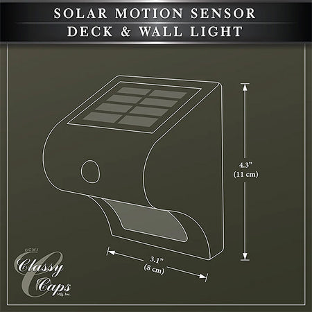 Note: This case pack contains 2 of the Classy Caps Motion Sensor Solar Deck and Wall Lights.