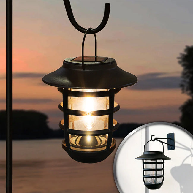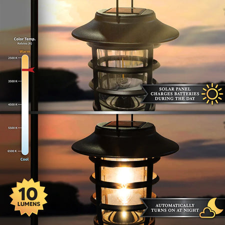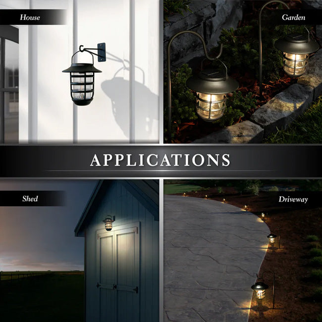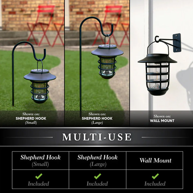 Bring timeless architecture along with a unique and elegant twist to your outdoor space with this 2 pack of Classy Caps Black Nottingham Solar Coach Lights. This helpful pair of lanterns provides a cascade of natural, warm light to your yard setting or patio, as each piece's high performance Edison Style LED provides pleasant illumination and a charming mood for the area. Each light sports a downward tapering, black cap to cover the illuminative bulb, with a black, caged shell surrounding the light for an attractive and fetching outdoor embellishment. Each light's solar panel converts sun energy into electricity during the day, and the lights turn on automatically at dusk to brighten a pathway or outdoor table without requiring any additional work. Multiple mounting options let you tailor these lanterns to your particular outdoor needs. Each unit comes with a 28" tall shepherd hook to give you a generous and elevated showcase, along with a handy wall mount bracket to display it against a fence or wall. A long life AA Ni-MH rechargeable battery is included with each light to give you a lasting and reliable lighting source, with each item giving you 10 Lumens of warm light in your garden or walkway at night. A real glass lens complements the durable stainless steel and aluminum construction of the lights, lending you a lasting and staunch pair of accessories that will grace your yard for seasons of service. Cast a warm and comfortable cascade of light over your garden or patio while providing a dazzling bit of décor with this pack of Black Nottingham Solar Coach Lights. One year limited warranty.