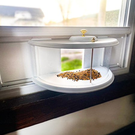 - Durable white, PVC lumber bird feeder specifically made to sit slightly inside your home.