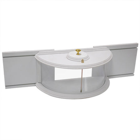 - Stepped, circular cap with brass knob lifts for refilling the reservoir.