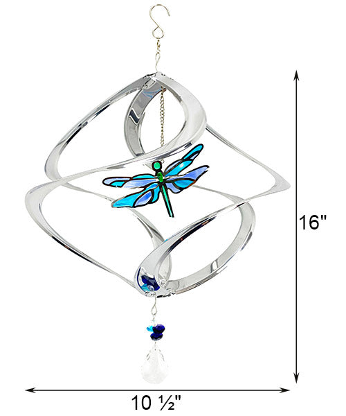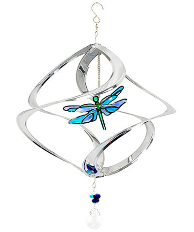 Blend aquatic elements with your favorite flowers by placing this Stainless Steel Cosmix Dragonfly Garden Swirl in your flowerbed. Dragonflies are often symbols of transformation and adaptability, and this piece will surely bring a new element to your garden décor. Four stainless steel bands create the open framework, each connecting at the top and base for a robust display. Each arm spirals toward the base for a wave-like effect, and a droplet shaped glass pendant completes the item. A stained-glass inspired, dragonfly shaped suncatcher occupies the center of the swirl, with green, teal, and blue hues inside its frame bringing fantastic, aquatic color to your yard. The reflective finish on the stainless steel bands adds shine and dimension to your yard, and a top, swiveling hanger ensures it can move freely in the wind. Transform your flowerbed into a showcase of moving art by adding this Stainless Steel Cosmix Dragonfly Garden Swirl to it.